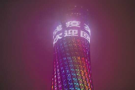 3月20日晚,广州塔、花城广场等地大屏幕滚动播放欢迎广东援湖北医疗队归来的灯光秀,迎接英雄回家 羊城晚报全媒体记者 周巍 实习生 惠天骄 摄