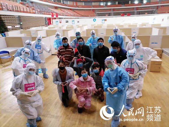 3月8日上午,武汉体育中心方舱医院2号舱患者清零,康复者出院前与江苏医护人员合影。江苏省人民医院供图。