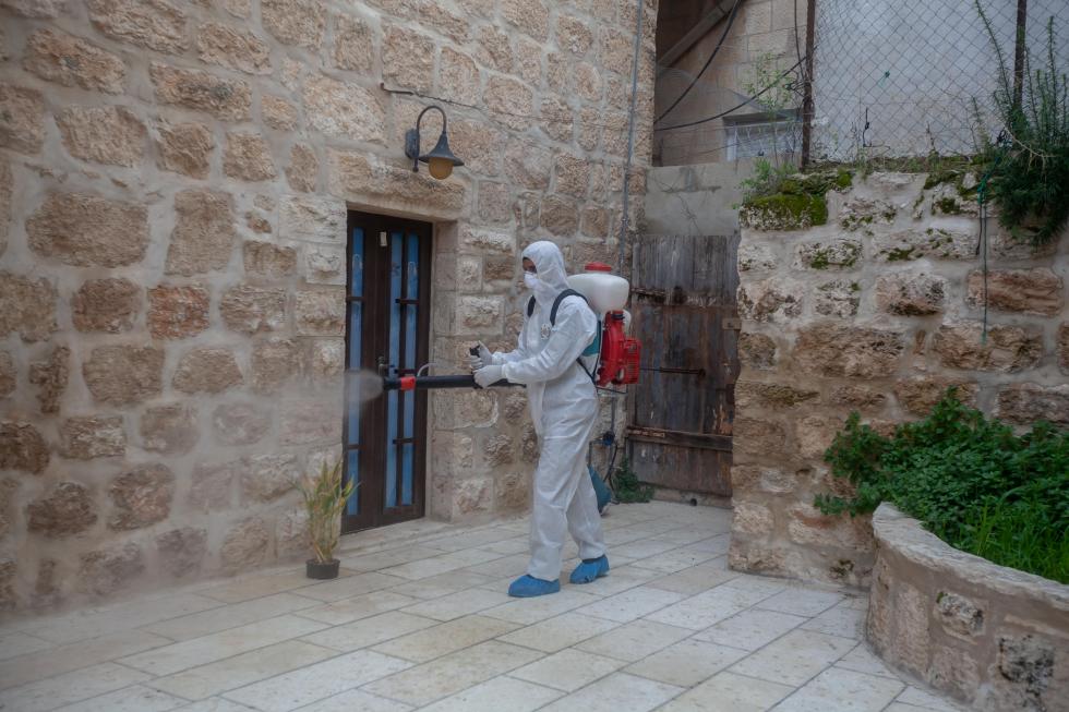 3月17日,在约旦河西岸城市伯利恒附近,工作人员对街道进行消毒。新华社发(卢埃·萨巴巴摄)