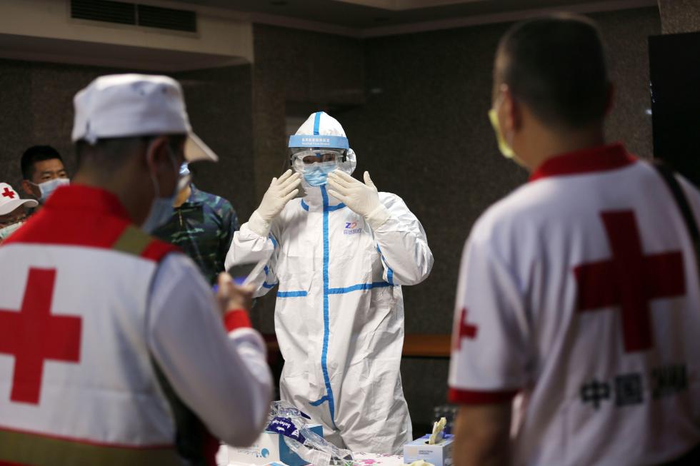 3月10日,在伊拉克巴格达,中国专家组成员徐永昊(中)进行模拟进入疫情污染区防护服穿戴演练。新华社发(哈利勒·达伍德摄)