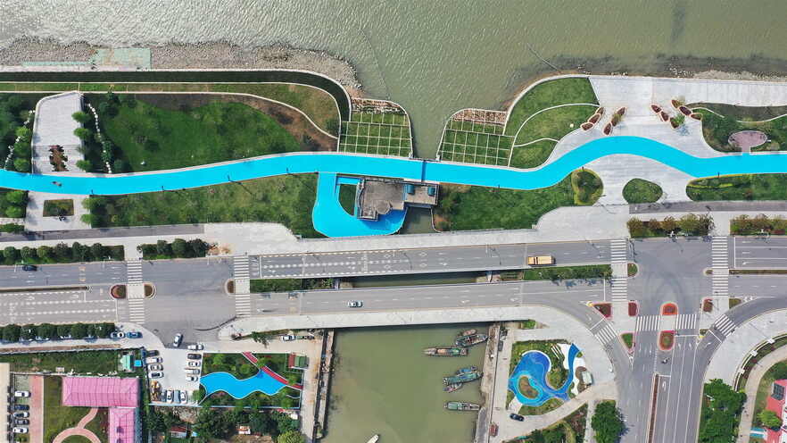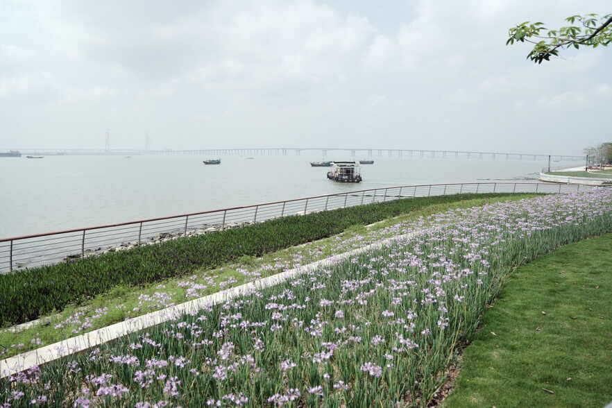 根据设计方案,工程结合堤岸布置滨海景观带,由外至内形成了河外滩地、主题花园、6米宽的主园路系统,包含跑步道和自行车道,再到车行公路带。