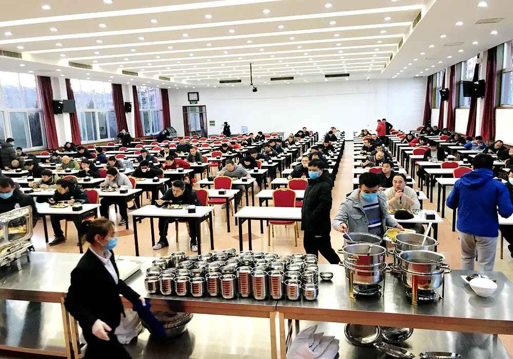 隔离区每天定时定点消毒,所有工作人员全程佩戴口罩、手套。就餐人员进入餐厅要监测体温,座位实行“考场式”布置——一人一桌,拉大间距,朝向一致,不随意走动。