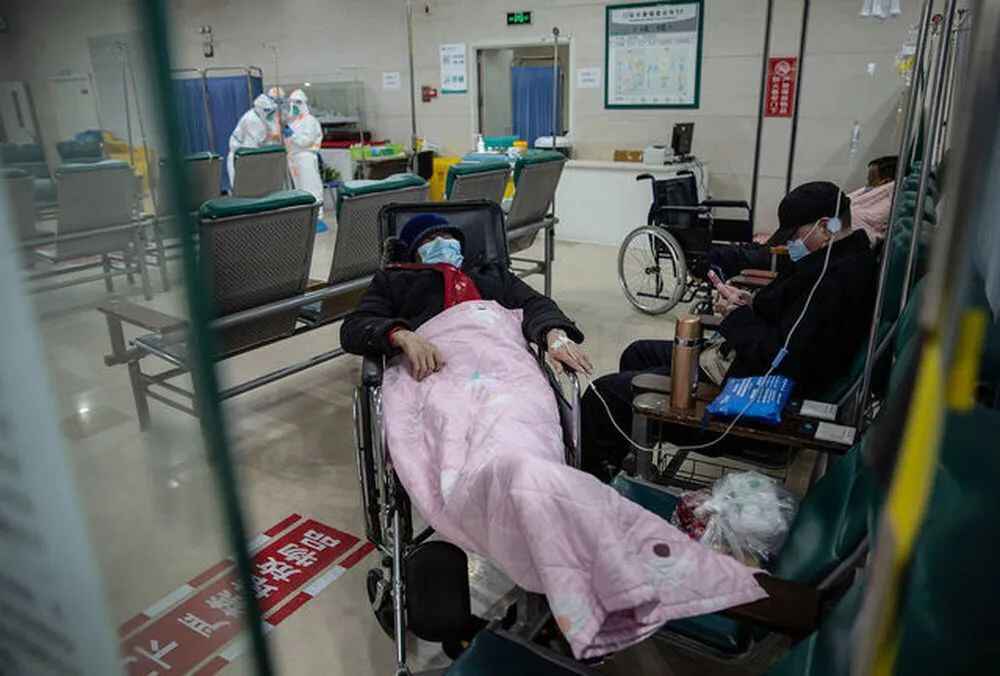 3月19日,武汉协和医院输液室内,一位老年患者躺着输液。新华社记者 李峥苨 摄