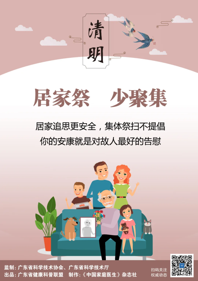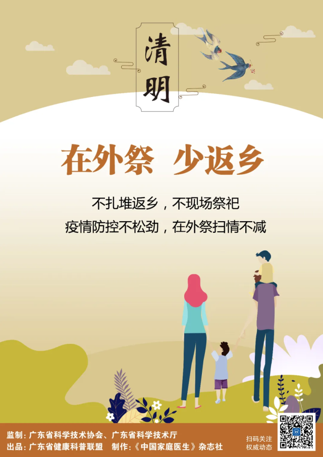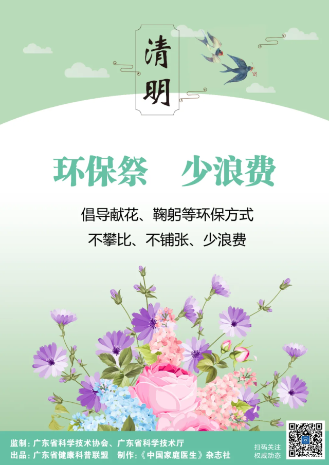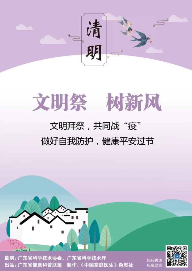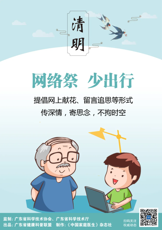 祭祀在心,不在于形,面对疫情,保护好自己和家人的健康,就是对故人最好的告慰。由广东省科学技术协会、广东省科学技术厅监制,广东省健康科普联盟出品,联盟成员单位《中国家庭医生》杂志社制作的科学防控应急科普宣传画——清明篇倡议,文明祭扫破旧习,移风易俗树新风,让我们共同努力,共同行动,巩固疫情防控成果,维护我们的家园环境。