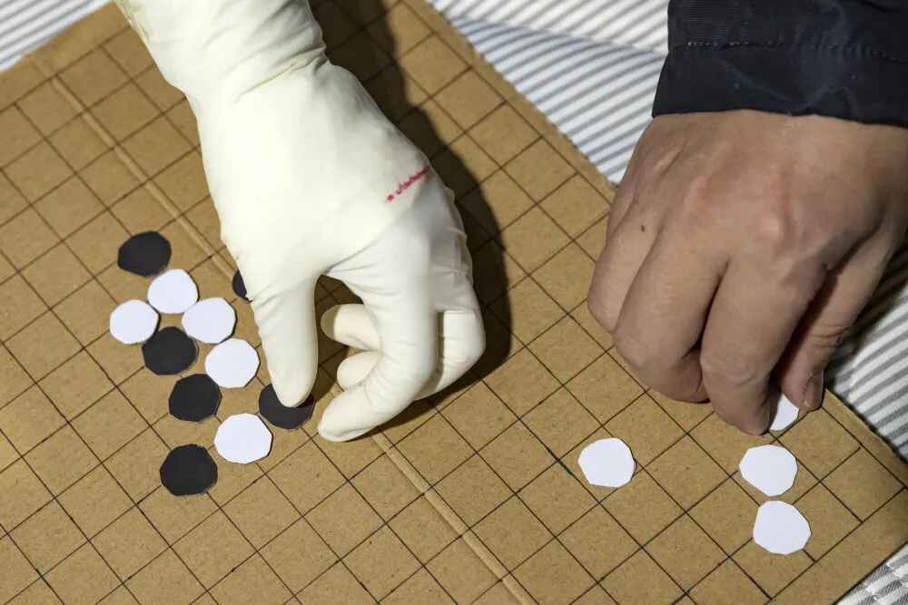 3月10日,在武昌方舱医院内,一名新冠肺炎痊愈患者(右)与青海医疗队队员马振华用江西医疗队队员自制的棋盘和棋子下五子棋。