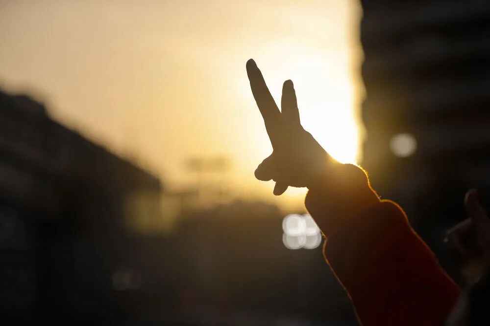 3月10日,在武昌方舱医院举行的武汉方舱医院休舱仪式后,江西援助湖北医疗队队员做出胜利的手势。