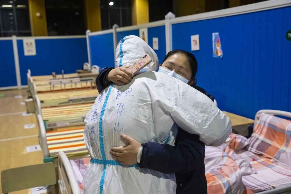 3月9日晚,在位于武汉市洪山体育馆的武昌方舱医院,当晚还留在该方舱的新冠肺炎患者应女士与上海复旦大学附属华山医院医务人员曹晶磊拥抱道别。应女士从该方舱开舱之初即入住这里,与不少医护人员结下了深厚的友谊。