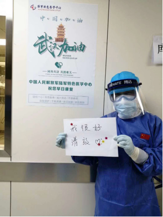 我轻握老孟的手:“您知道我是谁吗?”他口角微微翘起,右手指着我面屏上的“医”字,笑了。我点点头:“对,我们是医生!”“您知道我们是哪里来的吗?”我又问,他摇摇头。“我们是来支援湖北的解放军军医,是专门为您治病的。”我俯身在他耳边说。老孟突然紧紧握住我的手,泪水止不住地流。我也没忍住,潸然泪下。来到武汉后,发现自己更容易落泪,因为有太多的不易与感动。