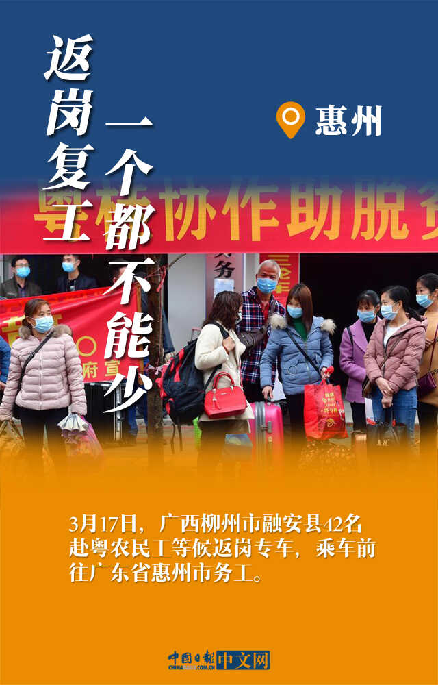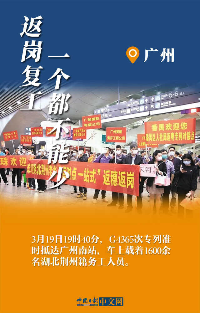 当前,国内疫情防控形势积极向好。3月25日零时起,湖北省除武汉市以外地区正式解除离鄂通道管控,鄂籍务工人员陆续踏上返岗之路。连日来,各地政府各企业纷纷出台措施,为务工人员返岗复工“保驾护航”,采取 “点对点、一站式”等办法,通过专列、专车、包车等方式,成规模、成批次组织务工人员尽快返岗安全复工,确保返岗复工,一个都不能少!