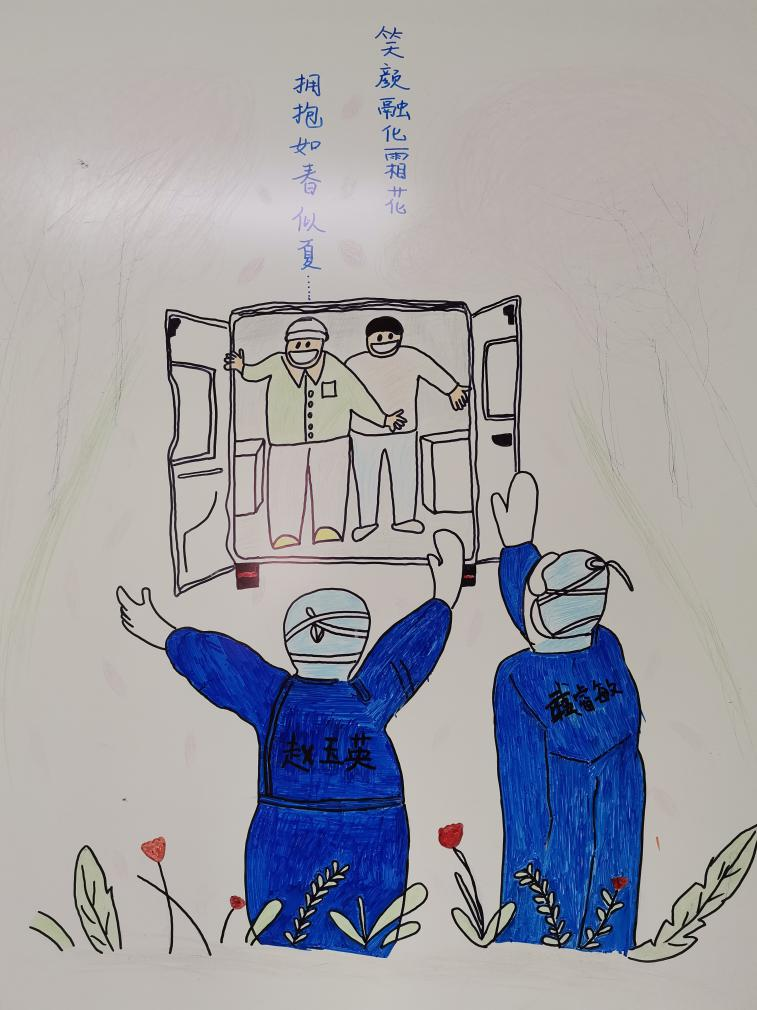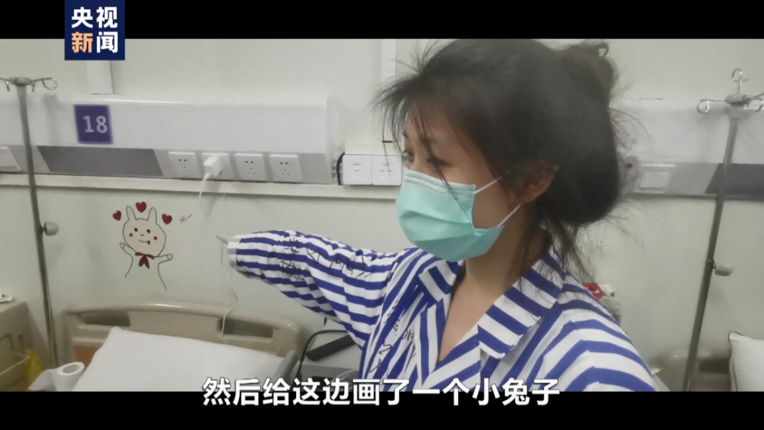 小梅和妈妈 一起住进了火神山医院 小梅在行李里发现了一支笔 便在床头画了一幅画   医生看到了 让护士送来三支记号笔
