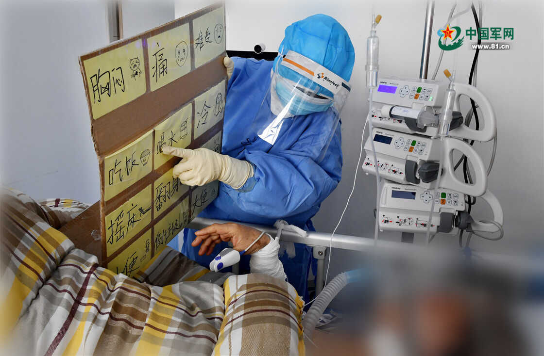 医护人员自制提示板,为重症患者提供护理服务。解放军报记者 王传顺 摄