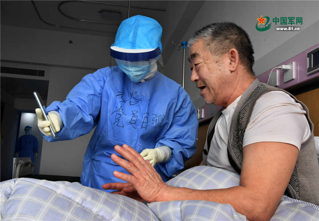 陈大爷的手机没有视频功能,护士白雅用自己的手机让陈大爷与家人视频。解放军报记者 王传顺 摄