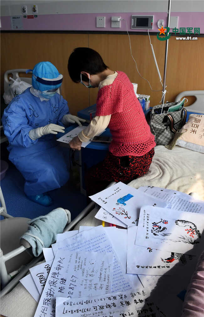 从死亡线上被拉了回来的陈女士,用笔给每名医护人员画了一幅画、写了一段祝福语,以表达对医护人员的感激之情。解放军报记者 王传顺 摄