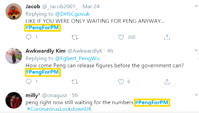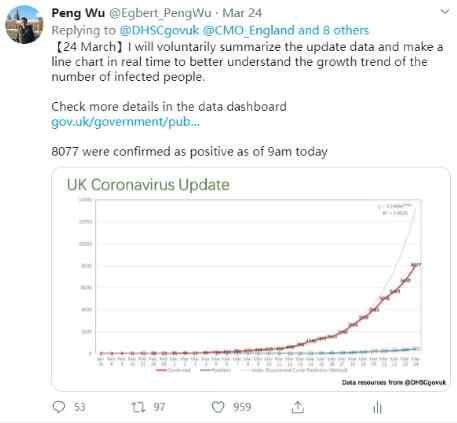 从3月5日起,吴芃根据英国发布的官方数据制作相关的疫情图表,每天一张,还都留言发布在英国卫生和社会保障部的疫情通报下面。没过几天,社交媒体上吴芃的的粉丝过万。一方面,不少在英国具有社会影响力的人开始关注他,议会议员、NHS医务工作者、BBC主持人、著名媒体主编、公司CEO等;