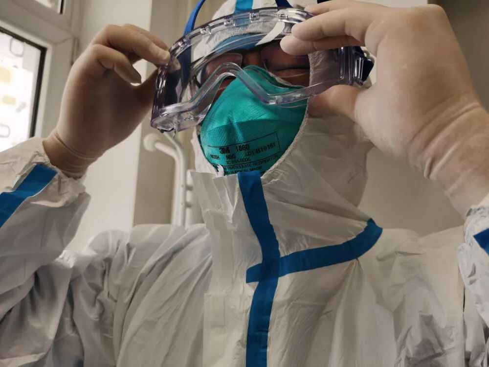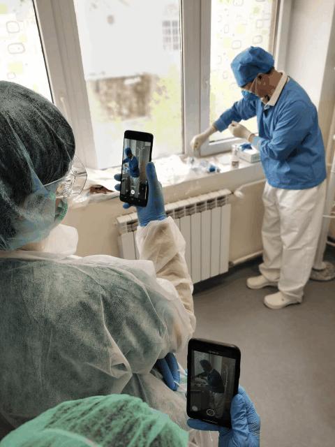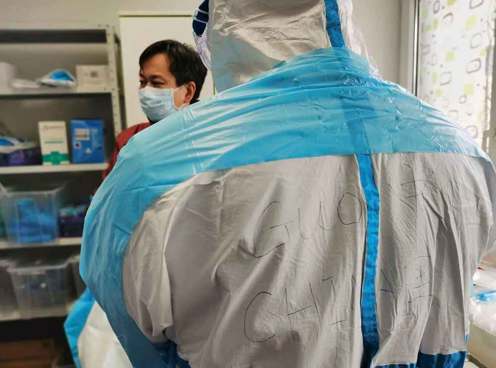 当地医护人员拍摄记录下专家组成员郭禹标穿戴防护服的过程。