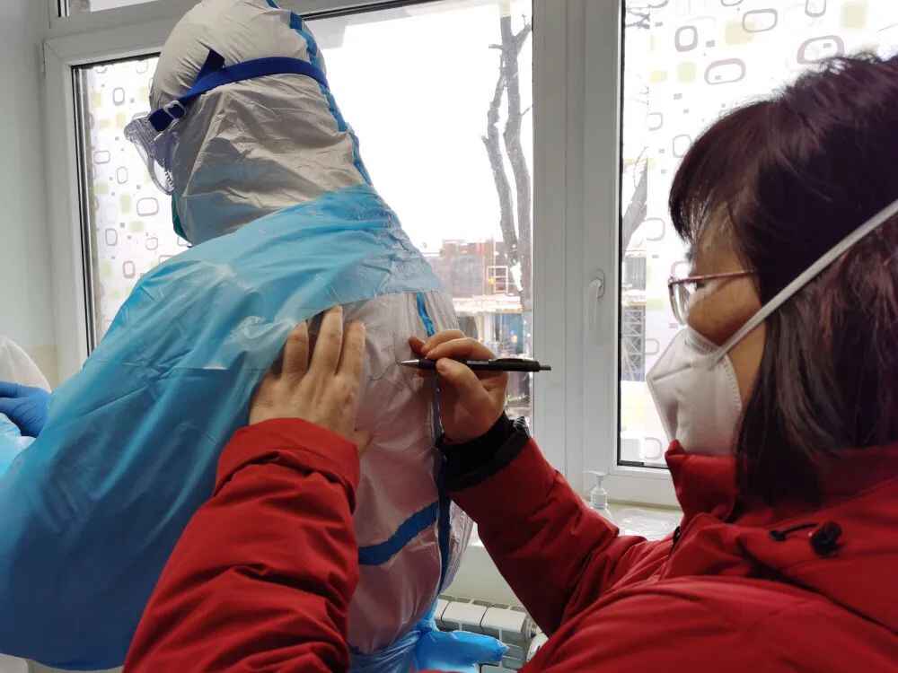 熊艳为郭禹标的防护服写名字。