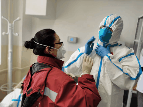 进入重症病房前,专家组成员侯彩兰(左)协助林炳亮穿戴防护服。