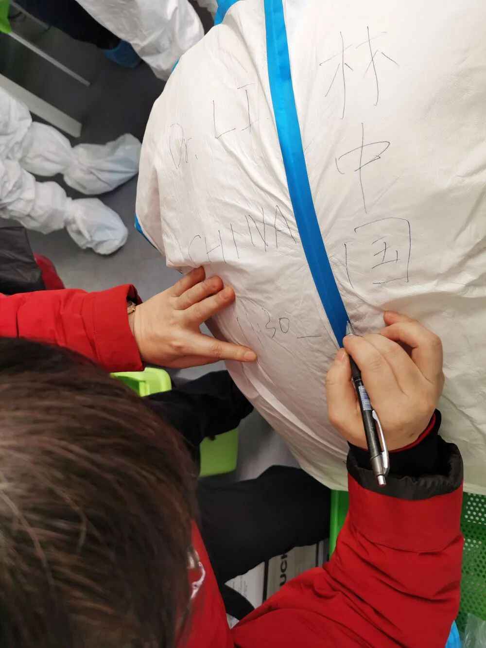 穿上防护服后无法辨认身份,大家会在防护服上写上名字以方便区分。专家组成员熊艳在帮林炳亮写名字的时候写上了“林中国”。