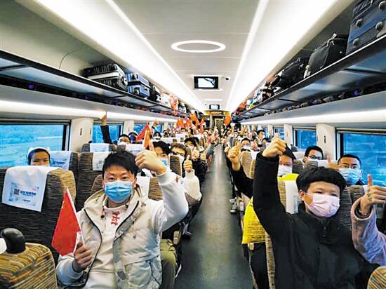列车开门后,240名旅客在车站工作人员和志愿者的引导下依次下车。为了欢迎乡亲回家,武汉铁路人拿出了特别礼遇:站台接车、专人引导、挥手相迎、鲜花掌声……