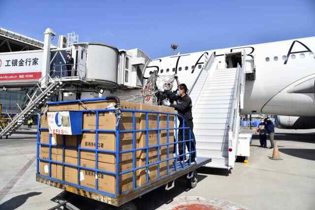 3月28日,在济南遥墙国际机场,工作人员将山东省赴英国联合工作组携带的援助物资装机。新华社发