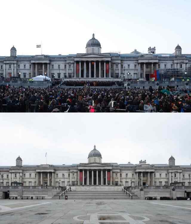 拼版照片显示:(上)2017年3月23日,人们在英国伦敦特拉法加广场参加活动。(下)2020年3月19日,英国伦敦特拉法加广场行人稀少。新华社发