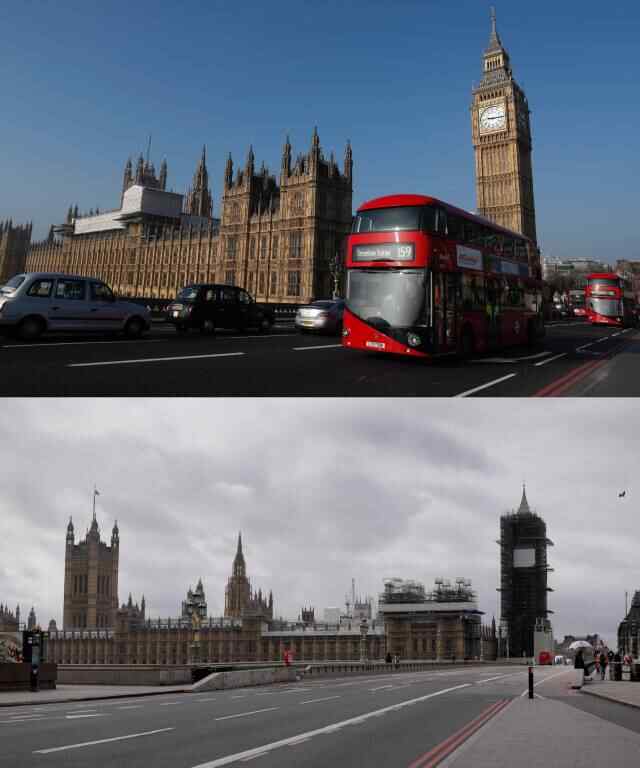 拼版照片显示:(上)2017年3月28日,在英国伦敦,车辆从议会大厦前经过。(下)2020年3月18日,在英国伦敦,威斯敏斯特桥和议会大厦行人寥寥。新华社发