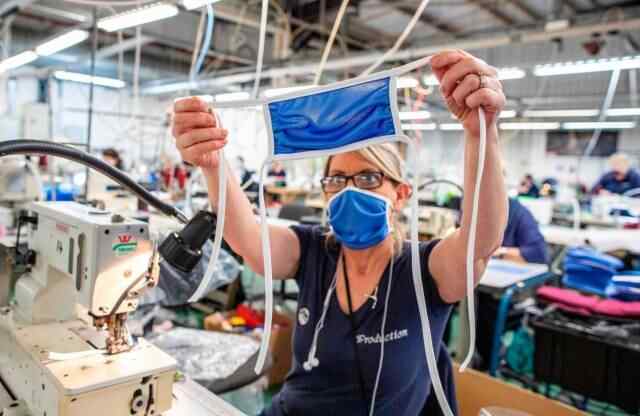 3月26日,在英国斯特拉班,一名工作人员在一家工厂制作口罩。新华社发