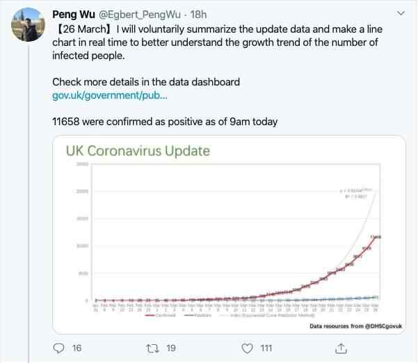 吴芃本科毕业于中国社会科学院大学社会工作专业,随后赴英国利兹大学读研。3月5日起,他每天坚持在推特上发布英国疫情走势图(英国官方后来也做了发布图表的网站,但更新速度比较慢),关注的人越来越多,英国下议院议员、地方议会议长等都被他“圈粉”,还有人发起“PengForPM(吴芃当首相)”话题,每天催他更新。吴芃的事迹也从英国火到国内。
