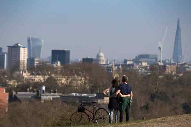 3月26日,在英国伦敦,人们在山坡上眺望远处城市天际线。新华社发