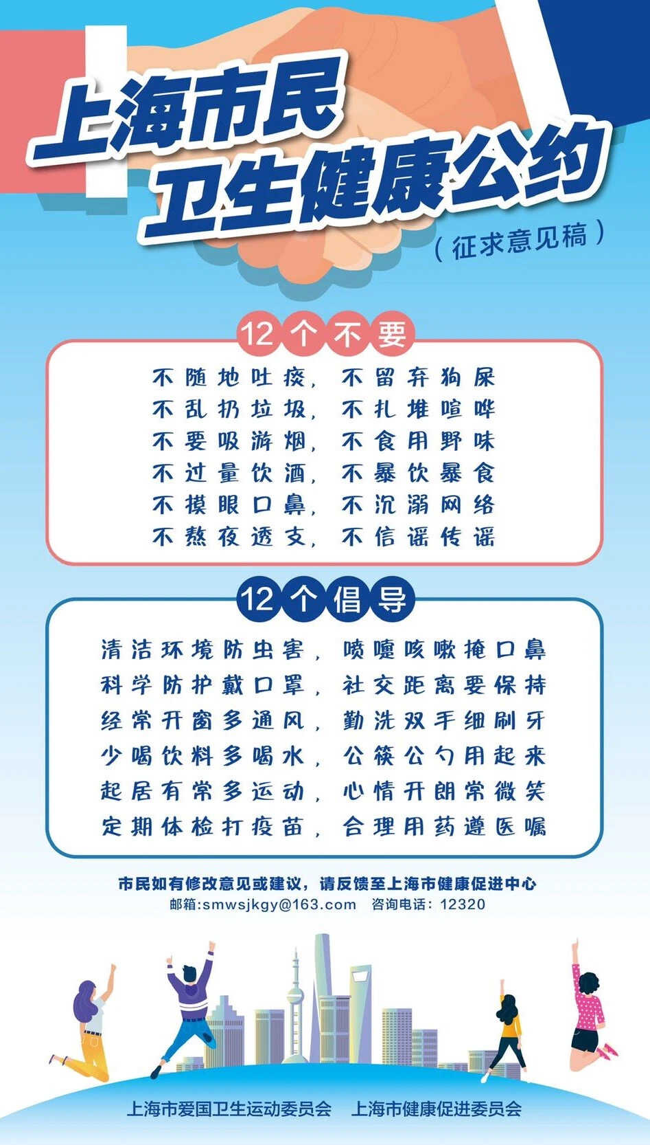 双12发布后,将广泛听取市民意见,汇集民智民意,修改完善后由市爱国卫生运动委员会、市健康促进委员会正式推出,将联合市文明办、市教委、市市场监管局、市绿化市容局、市体育局等开展跨部门合作,动员市、区、街镇相关部门、社会各界、广大市民共同践行,让城市管理更精细、更有序,让市民生活更健康、更文明。
