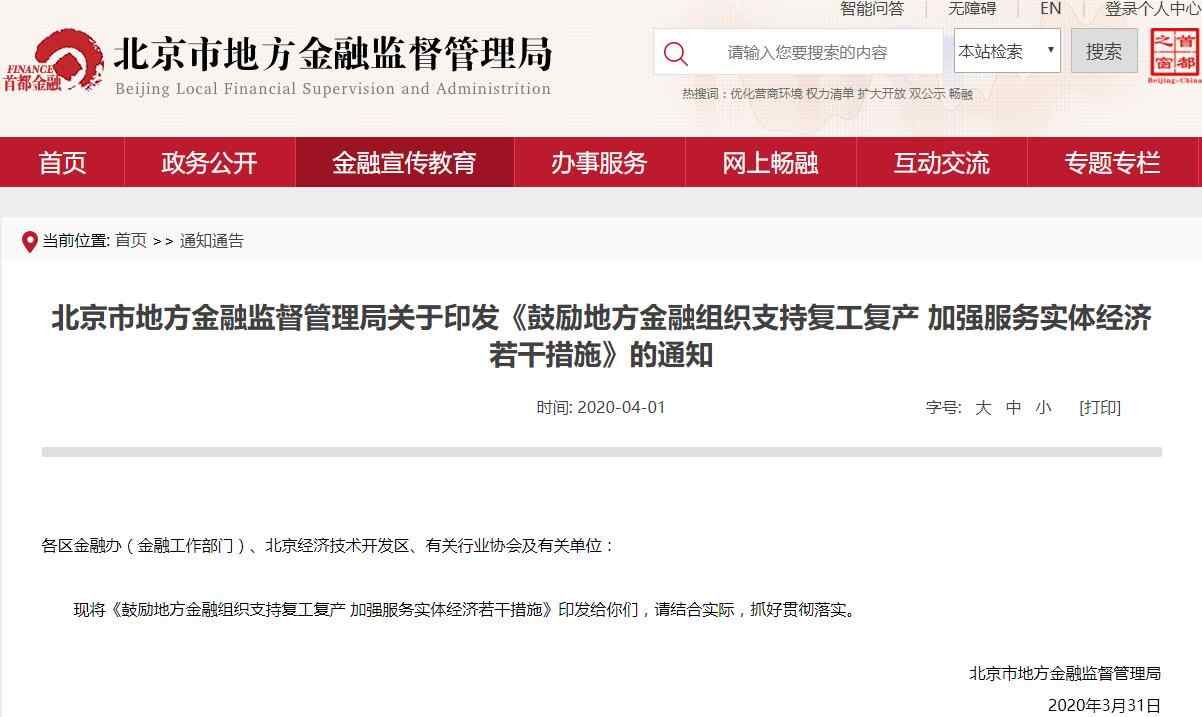 人民网北京4月2日电 (记者 鲍聪颖)一手抓疫情防控、一手抓经济社会发展,为助力企业复工复产,北京市地方金融组织发展迎来政策支持。4月1日,北京市地方金融监督管理局(以下简称“北京市金融监管局” )印发《鼓励地方金融组织支持复工复产加强服务实体经济若干措施》(以下简称《措施》),将对辖区内融资租赁、商业保理及小贷等地方金融组织加大监管支撑力度,适当放宽监管要求。