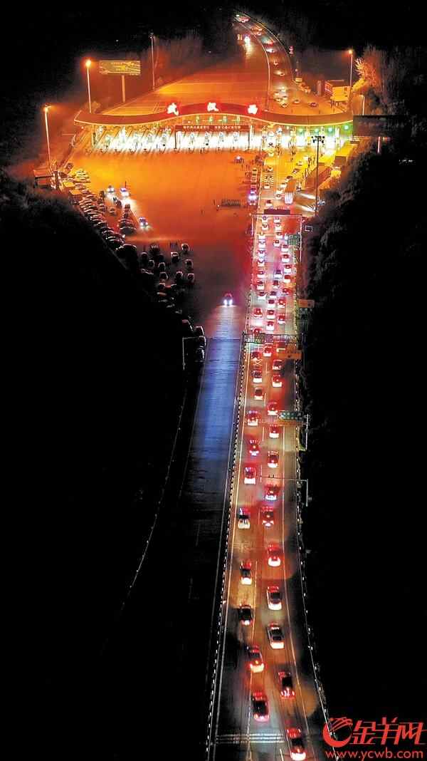 8日零时零分,解除离汉通道管控后(下图),武汉西收费站出城通道排起了长长的车龙(上图) 羊城晚报特派武汉记者汤铭明摄