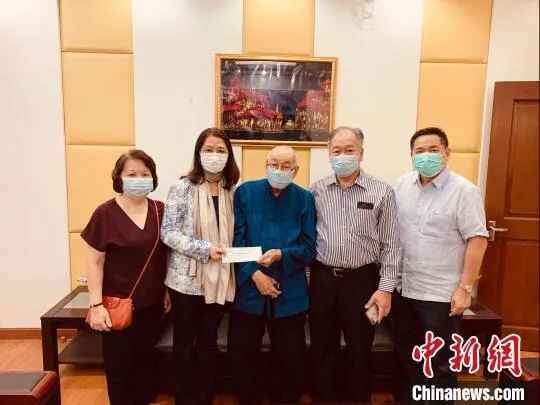 93岁的庄垂楷先生(右三)在长子、长媳与次子的陪同下来到了驻菲使馆领侨处,将支票交由董洪亚领事(左二)转交武汉同胞。驻菲使馆供图
