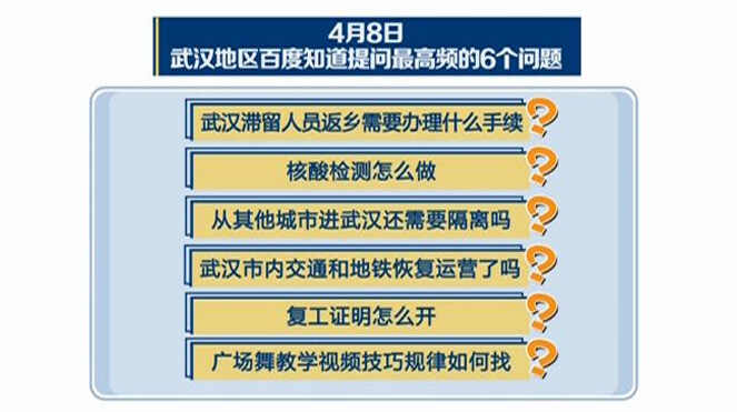 市民生活逐渐恢复,但防疫并未松懈,百度搜索数据显示,武汉地区网友最关心离汉、进汉是否要隔离、复工证明怎么开等问题,而“广场舞教学视频技巧规律如何找?”则排在第六位。看来恢复日常的心情虽然急迫,但武汉人依然在按照轻重缓急有序找回曾经的生活。
