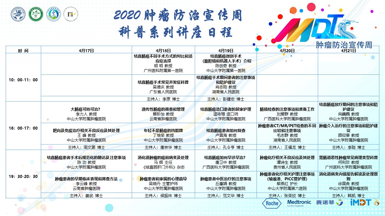 本次活动由中华结直肠癌MDT联盟、广东省健康管理学会主办,广东省抗癌协会大肠癌专业委员会、广东省抗癌协会遗传肿瘤专业委员会、广东省精准医学应用学会胃肠肿瘤分会协办,罗氏制药、美敦力、赛诺菲、妙悦iMDT、先声药业、国际日报报业集团及云嘉集团提供支持。活动期间,将安排丰富的线上直播内容,包括线上MDT案例讨论、广大病友关注的癌症知识科普患教课堂、医患温情故事等。