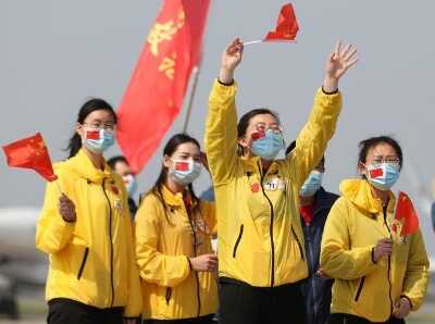 医疗队员们走下飞机。中新社记者 泱波 摄