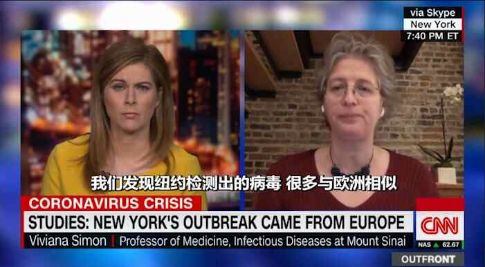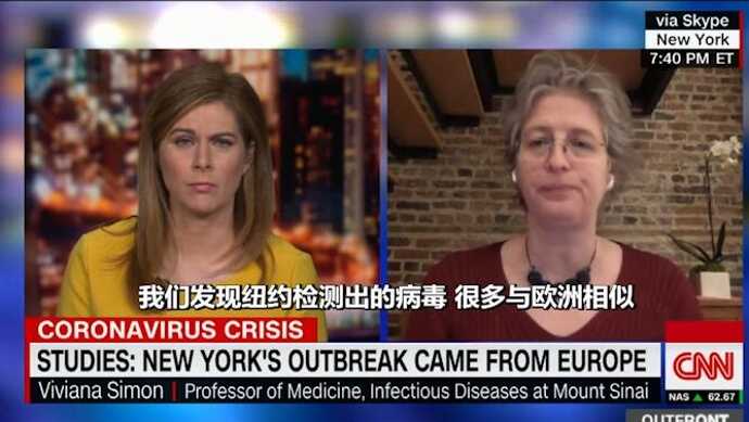 此外,当天的节目还连线了西奈山伊坎医学院微生物学和传染病学教授薇薇安娜·西蒙,薇薇安娜·西蒙在连线中直言,“这个研究结果在意料之中,但是欧洲输入病例的范围之广出乎我们的意料。”