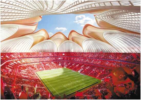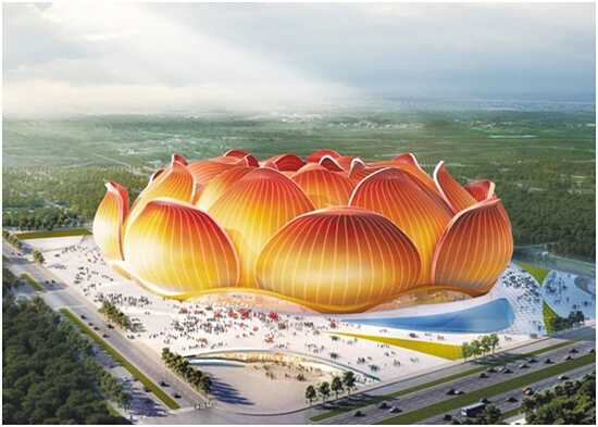 除了建设规模,球场规划设计造型也备受瞩目。为确保球场拥有世界一流“颜值”,恒大力邀来自美国、德国、英国、澳大利亚等国家的23位顶级大师,设计了上百个方案。最终球场由美国顶级大师Hasan.A.Syed亲自主笔操刀设计,以荷花绽放为设计理念,充分融合中国文化精髓,既代表球场将成为“花城”广州享誉世界的新名片,也寓意着中国足球拥有高洁、坚韧的品格。球场主色调采用炙热的金红色,这是广州恒大球队的队服色。