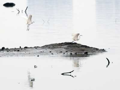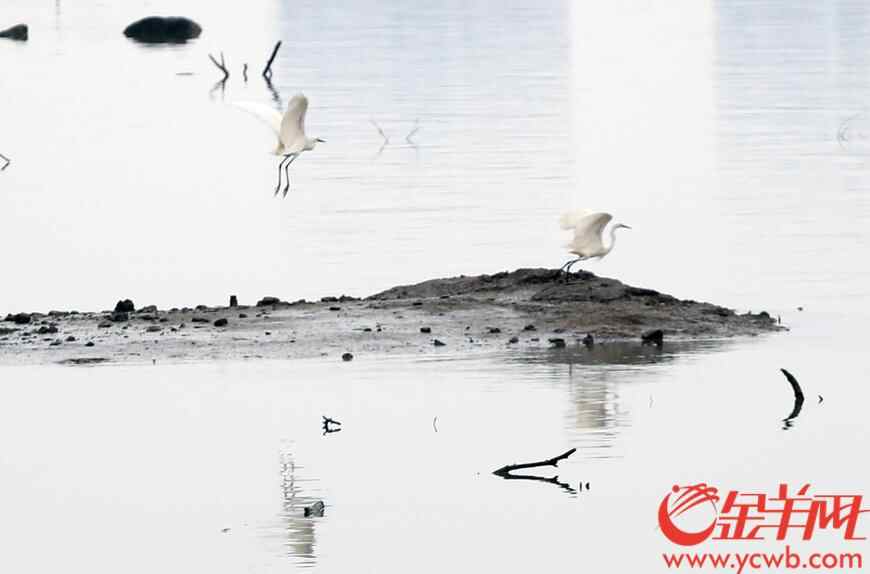 广州番禺沙滘围堤围,鹭鸟在浅滩嬉戏 梁怿韬 摄