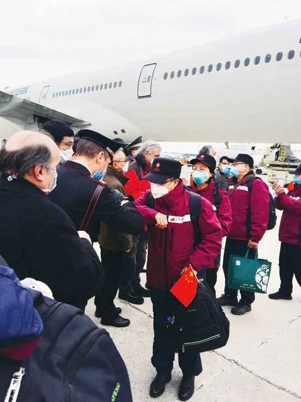2020年3月25日,在意大利米兰马尔奔萨机场,意方人员以“击肘”的方式欢迎中国第三批赴意大利抗疫医疗专家组成员的到来。