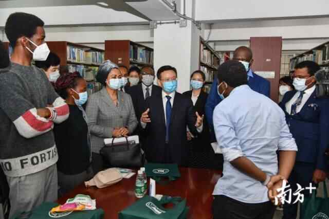 副省长张新(中)与非洲多国驻穗总领事看望非洲国家留学生。