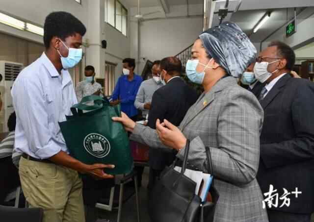 非洲国家驻穗领团团长、马里驻穗总领事艾丽玛·加库(右)向非洲国家留学生送“健康包”。