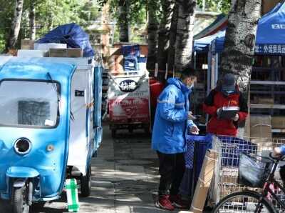 4月20日,北京科技大学社区居民在快递柜前取件。北京科技大学社区在允许快递员进入社区的同时,积极加强防疫。此前,北京市新冠肺炎疫情防控工作领导小组提出,有序放开快递人员等进小区,满足社区居民生活需求。中新社记者 蒋启明 摄