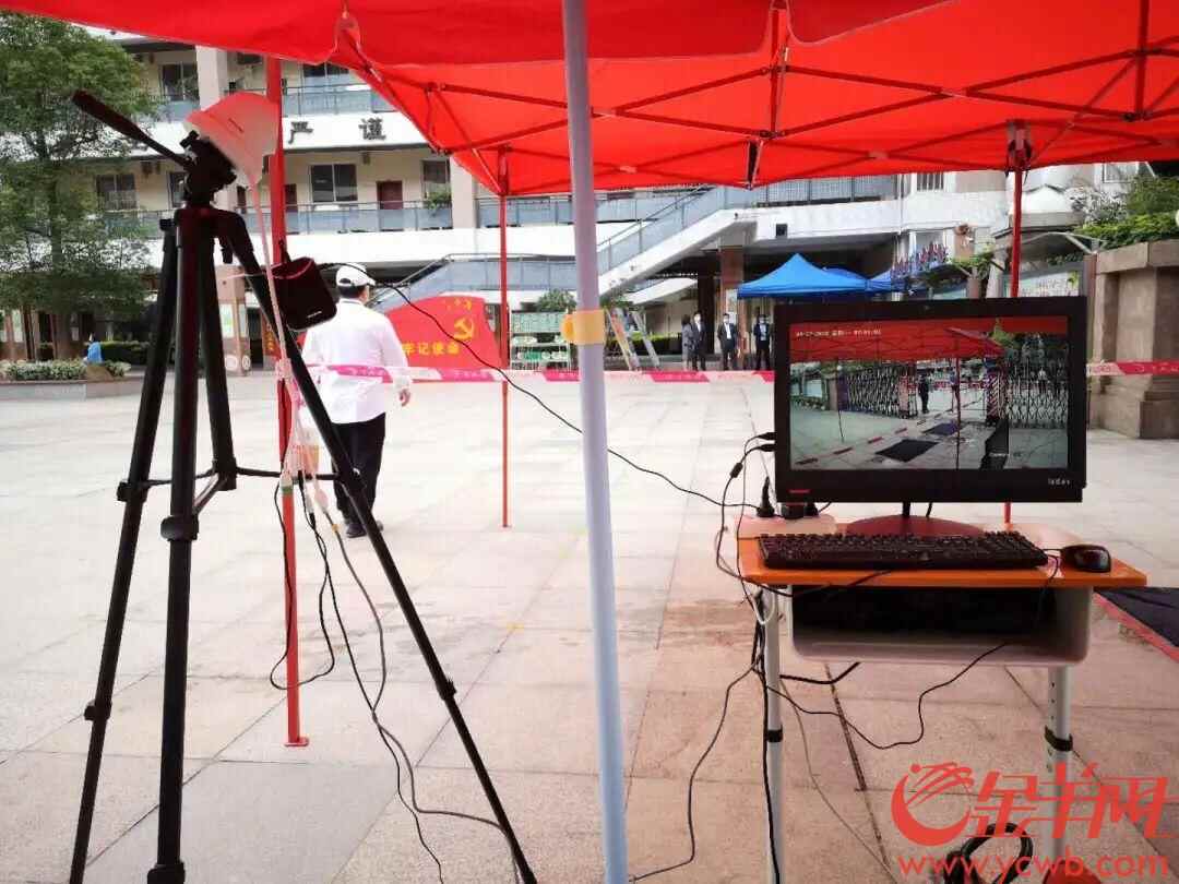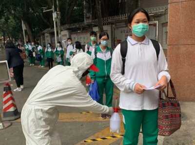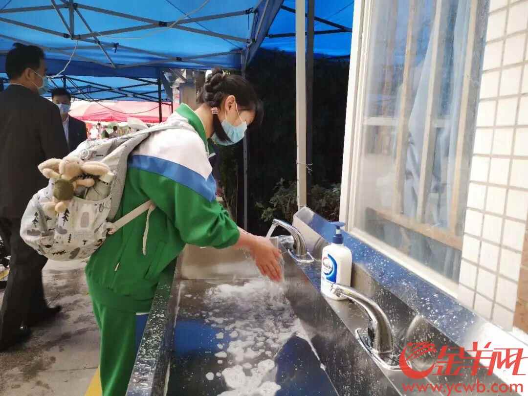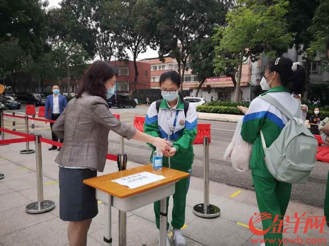 在广州市天河区汇景实验学校,值班教师、安保人员已经到位,佩戴口罩等防护用具准备初三学生入校体温筛查等工作。记者首先按学校要求进行登记、测温和用免洗消毒液净手。
