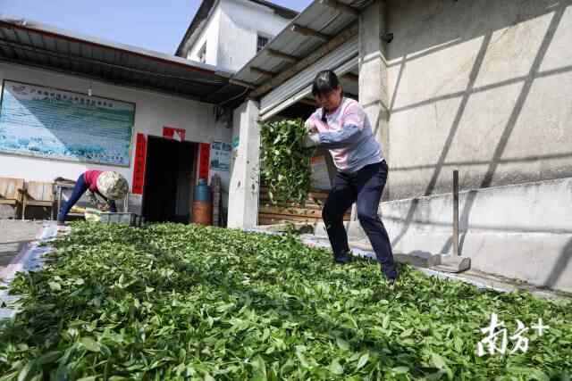 梅州梅江区清凉山的村民将采摘的茶叶进行晾晒。