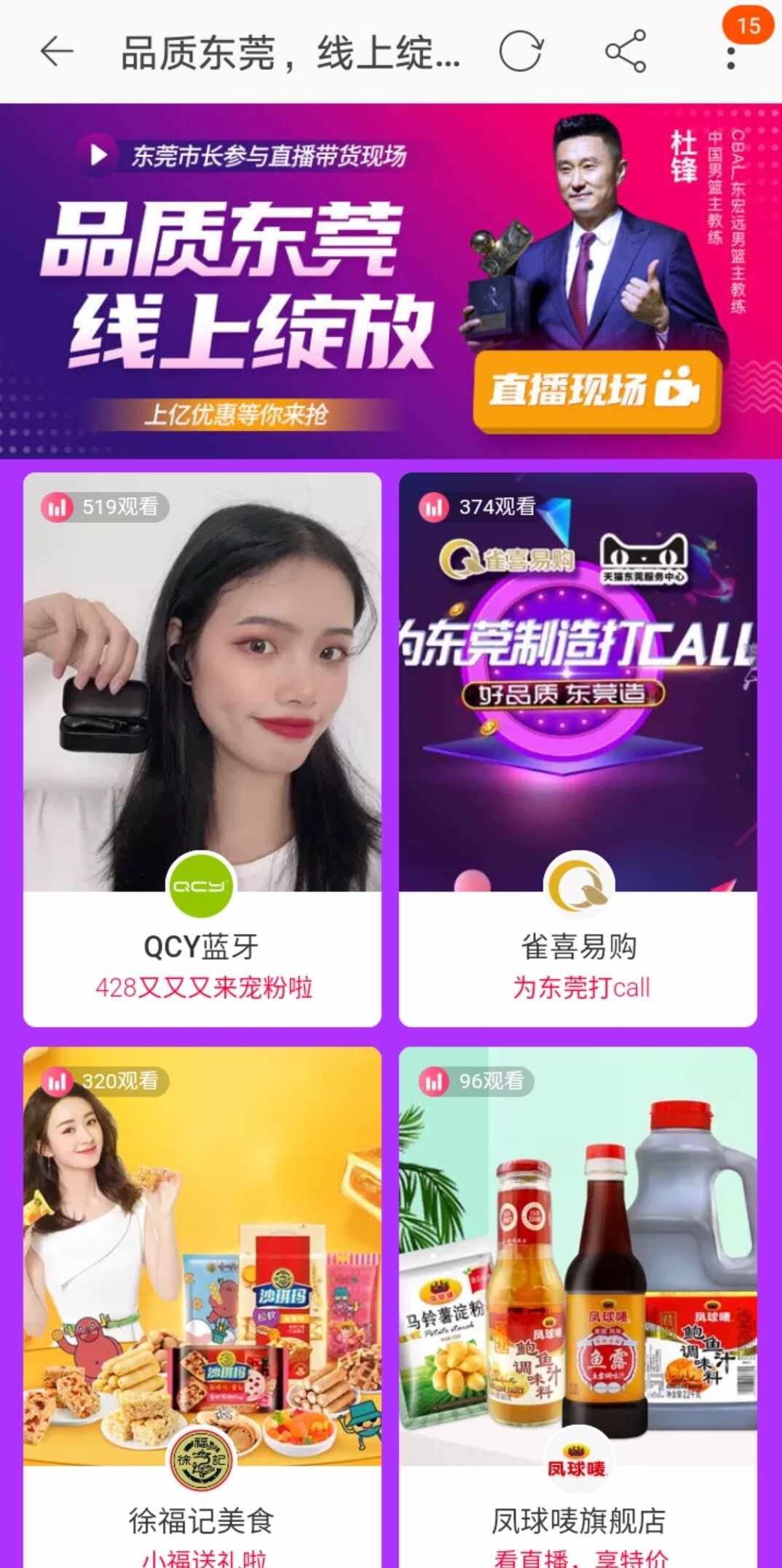 淘宝直播为东莞企业搭建的“品质东莞、线上绽放”专属页面
