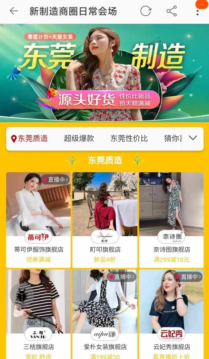 在27日零时,天猫为东莞企业上线“东莞制造,源头好货”的专属页面。天猫联动平台上的200家东莞女装工厂在天猫上线2500万件夏装,包括云妃秀旗舰店、psyp旗舰店、爱朴女装旗舰店等将售卖连衣裙、裤子、T恤、衬衣等单品。