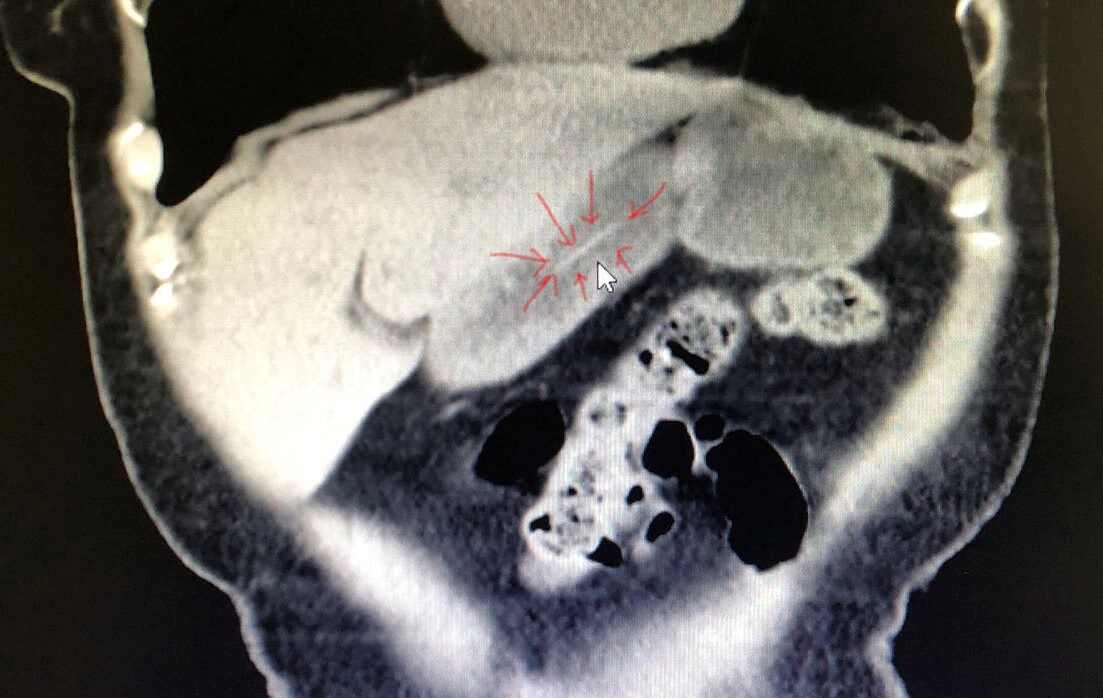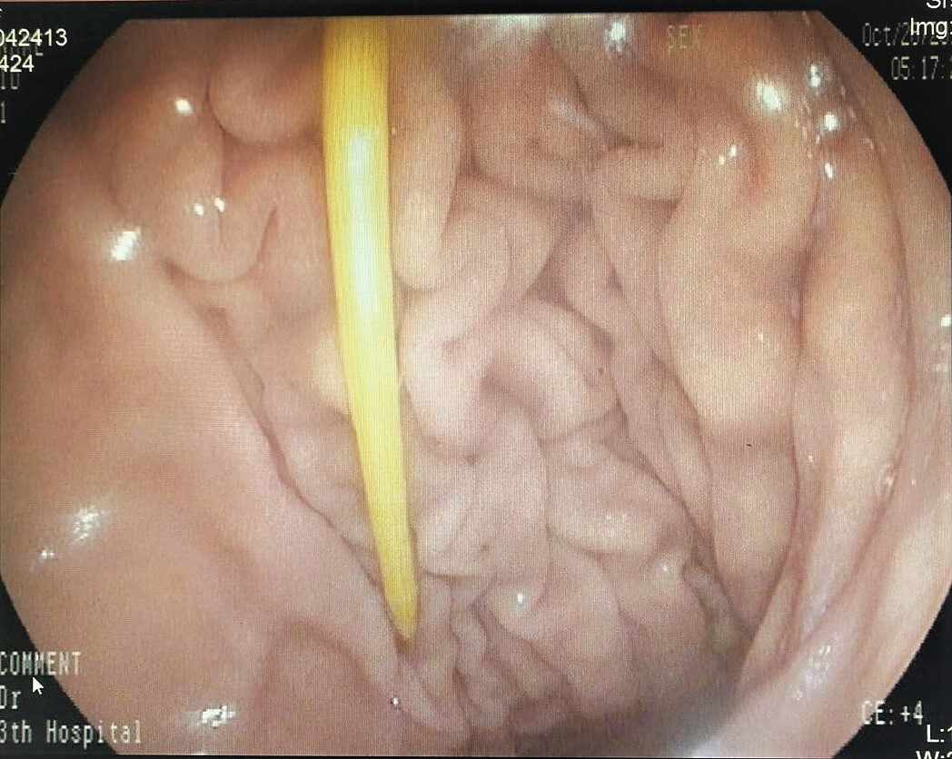 医生给张阿姨做腹部CT发现胃体部有长条状异物,考虑牙签滞留在胃内。牙签通常有6-7cm长,两头尖锐,吞服后极易造成消化道损伤甚至穿孔,严重者有可能刺穿胸腔或腹腔内大血管,随时可能有生命危险!再加上张阿姨平素有高血压、糖尿病、冠心病病史,临床操作和手术的风险较常人高出很多,病情紧急且十分棘手。发现牙签可能滞留胃内的情况后,南医三院消化内科主任岳辉带领团队立即给张阿姨进行了急诊胃镜检查,检查中果然在胃体部发现了一根牙签,所幸的是牙签尚未刺入胃壁。
