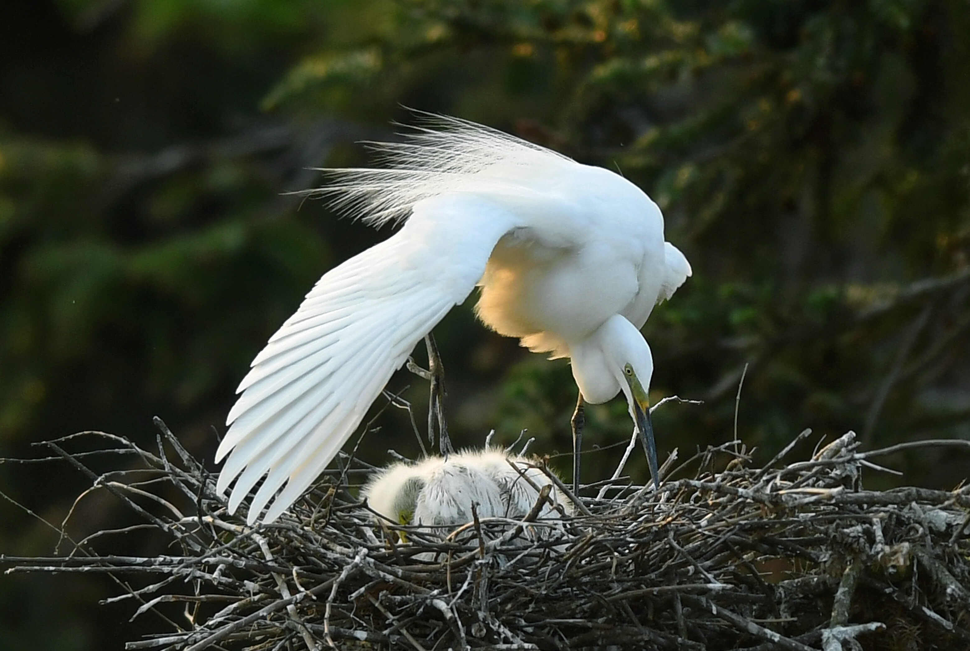 ↑在南昌市新建区象山森林公园内,一只白鹭在鸟巢内守护幼鸟(4月27日摄)。