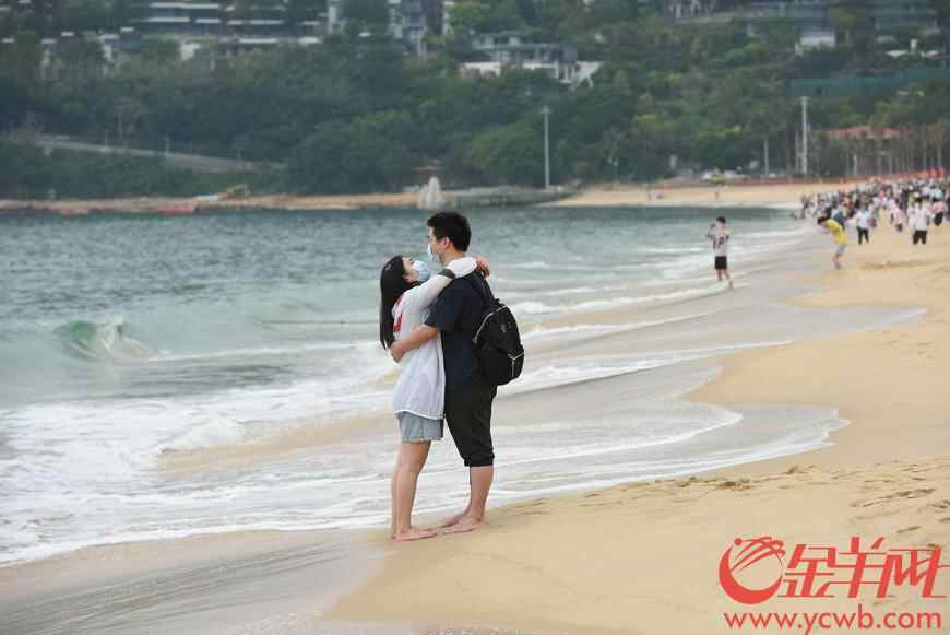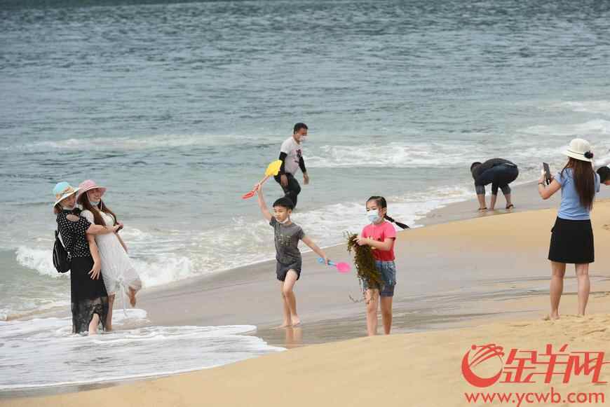 经过几个月的疫情,人们在面对大海和沙滩时表现出对自然的热爱,孩子们拉着大人的手踏浪嬉戏。市民在景区必须佩戴口罩,不能下海游泳。
